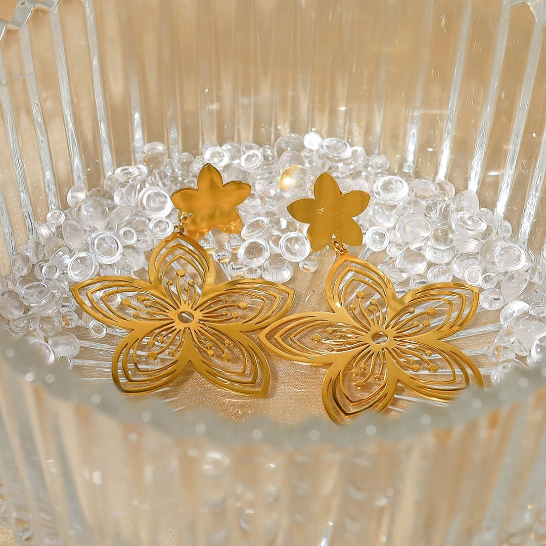 Introducing our Gold Plated Stainless Steel Flower Drop Earrings - a perfect blend of sophistication and modern style for today's woman. These glossy dangle earrings are meticulously crafted to enhance your every ensemble, ensuring you shine at every occasion. Whether you're dressing up for a party, a wedding, or simply accentuating your daily outfits, these earrings promise to uplift your jewelry game effortlessly.Product Features