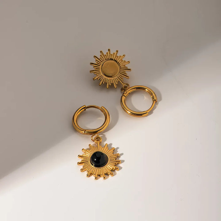 Elevate your look with our Sunburst Glow earrings, crafted to perfection for the modern woman who values elegance and sophistication. These stunning earrings feature a minimalist sun-shaped design adorned with lustrous black agate pendants, exuding an aura of timeless beauty.Features