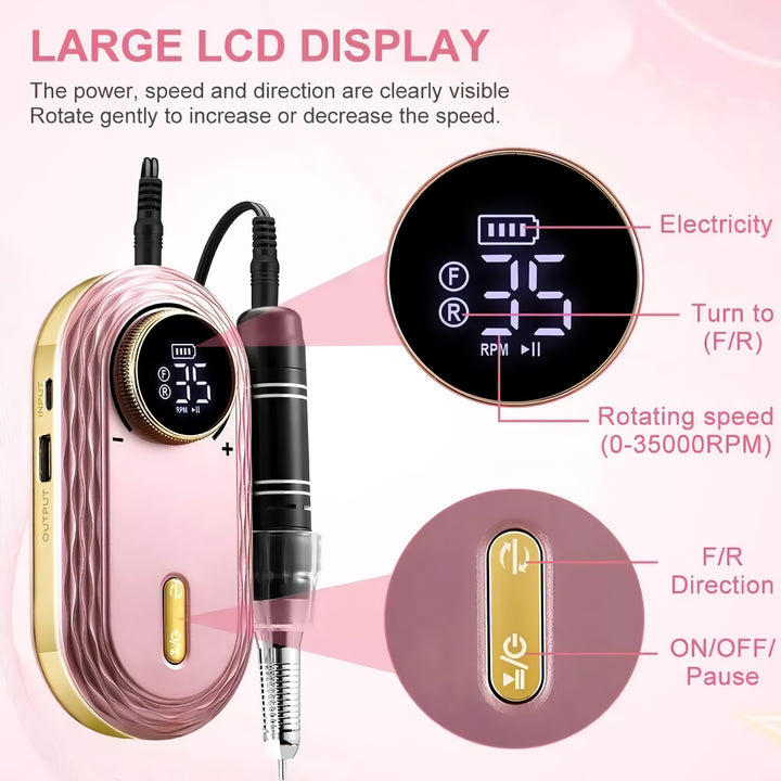The sleek design and advanced rose gold finish of our nail drill not only elevate your nail care experience but also provide a comfortable grip for precise handling. Its palm-sized handpiece allows for portability, so you can take it with you wherever you go.Experience the Ultimate Convenience