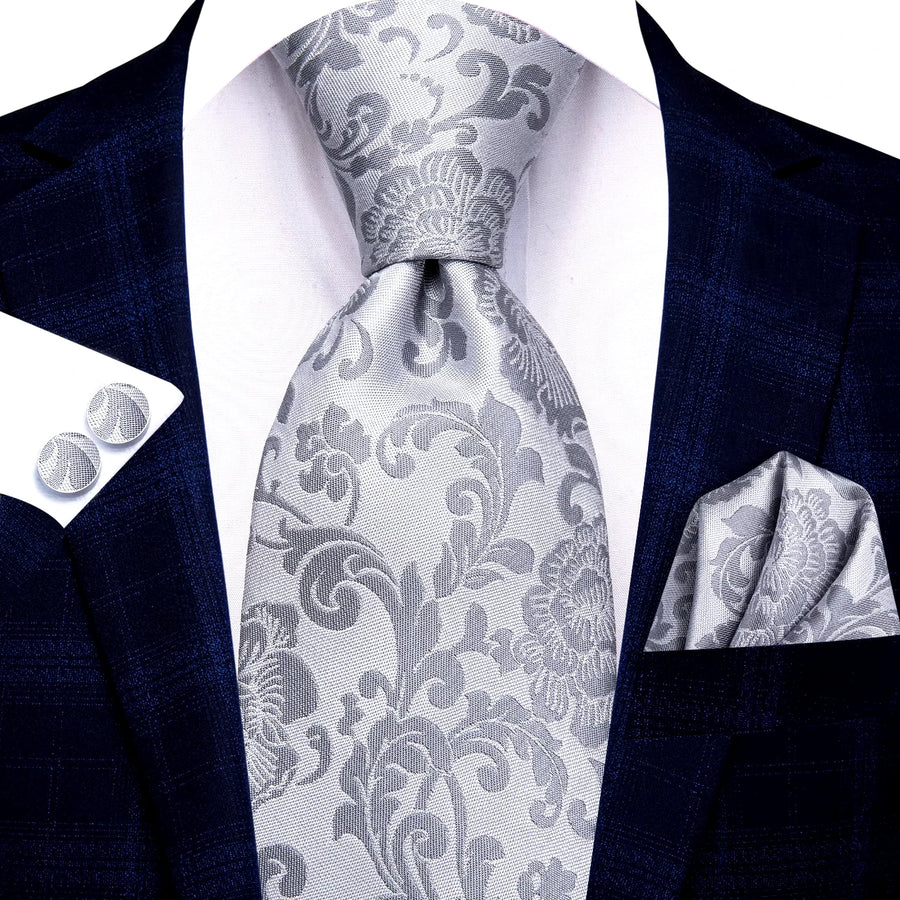 This men's necktie set stands out for its superior craftsmanship and elegant design. Made from high-quality silk, the jacquard weave gives the fabric a rich texture and ensures it holds its shape well. The combination of the silver grey color and floral pattern offers a versatile look that pairs beautifully with dark or light suits. Whether you're attending a wedding, a business event, or a formal party, this tie will complete your ensemble with class.Perfect for Any Formal Occasion