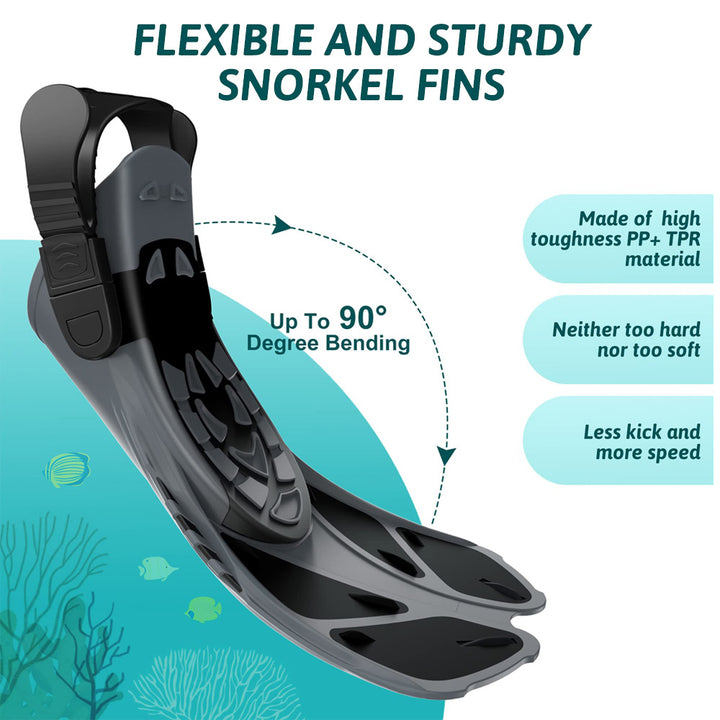 Whether you're snorkeling, diving, or simply enjoying a day at the beach, our Adjustable Open Heel Snorkel Fins offer unparalleled comfort and performance. The open heel design and adjustable straps ensure a secure and customized fit, while the durable materials and non-slip design guarantee safety and reliability.Unleash Your Inner Explorer