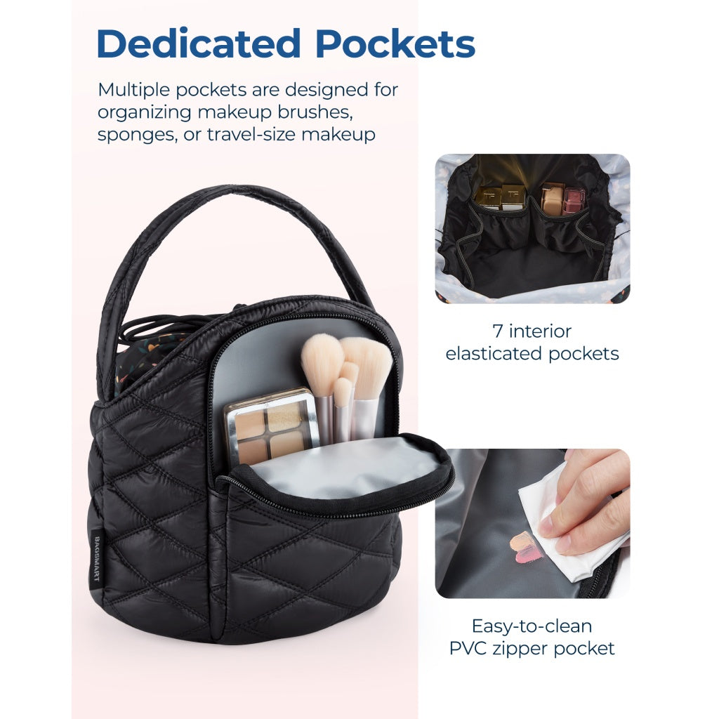 Our cosmetic bag features a roomy main compartment with seven elastic pockets, providing ample space to store all your makeup essentials. From foundation and palettes to brushes and accessories, this bag can hold it all. The elastic pockets are specially designed to securely hold your brushes, lipstick, mascara, and other small items, keeping them neatly in place and easy to access. Say goodbye to the frustration of digging for your favorite products.