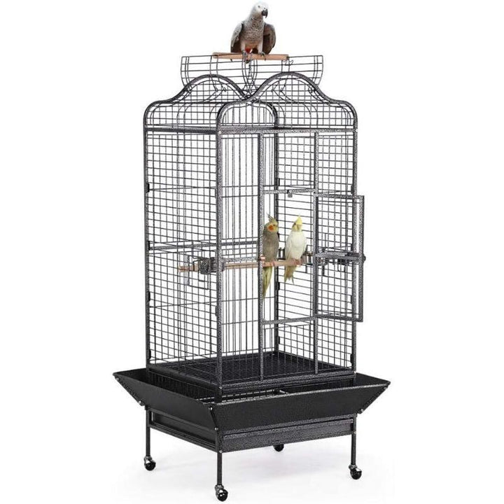 • Durable Construction: Built with premium iron and coated with a hammertone finish, this cage is both rust-resistant and durable. The sturdy welded frame guarantees long-lasting use, while stainless steel feed bowls and solid wood perches add functionality and safety.
