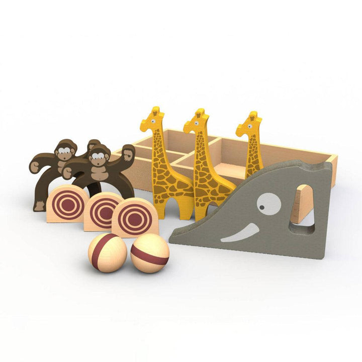 Each set comes with two wooden balls, an elephant ‘launching' ramp, three bullseye targets, three giraffes pins, and two monkey targets.